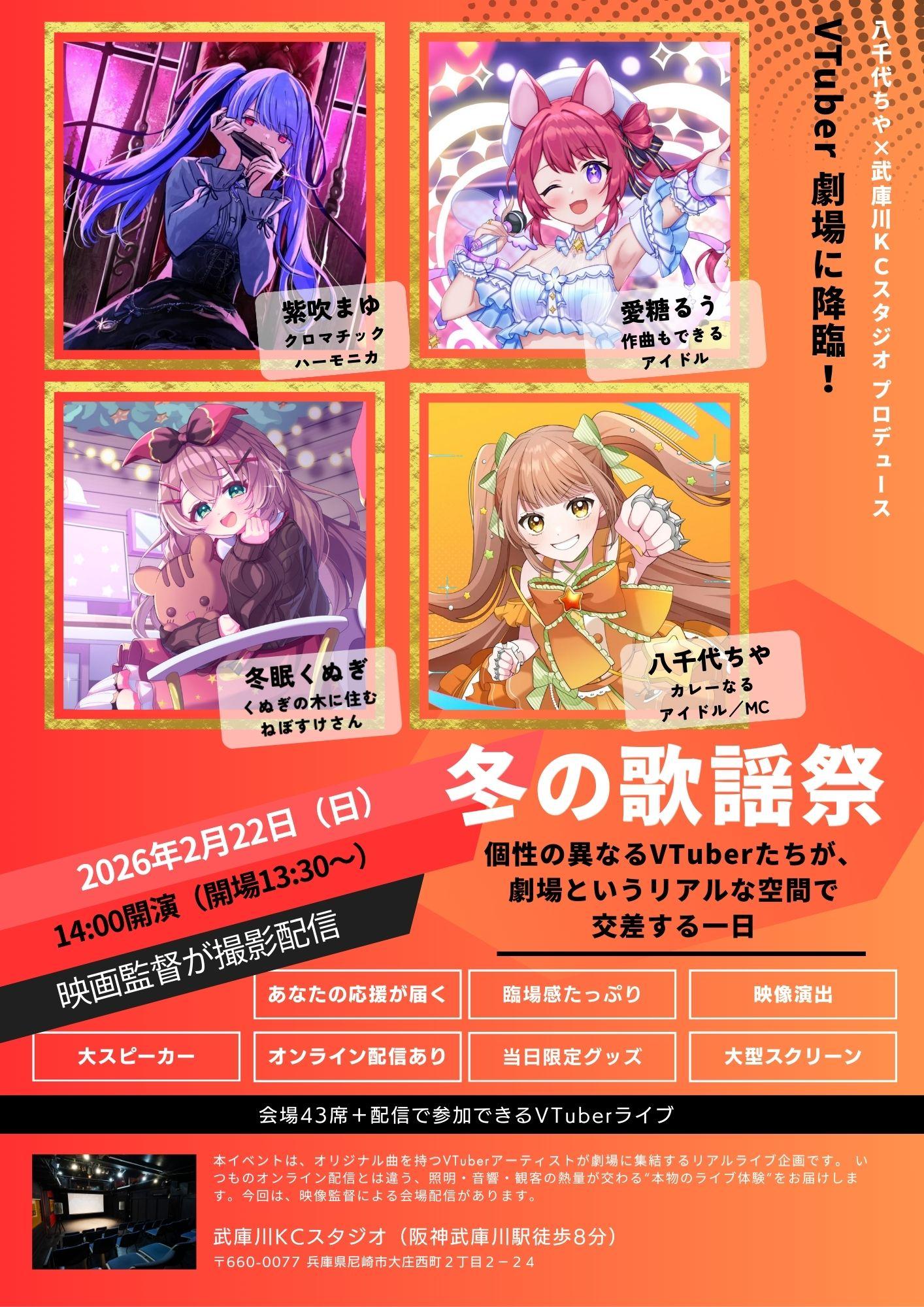 武庫川KCスタジオでVチューバーによる企画ライブを行います。オリジナル曲を持つアーティストたちが音×映×照明で臨場感あふれるパフォーマンスを行います。